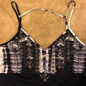 Dark navy and white tie dye Strappy, flowy tank with sequined neckline.