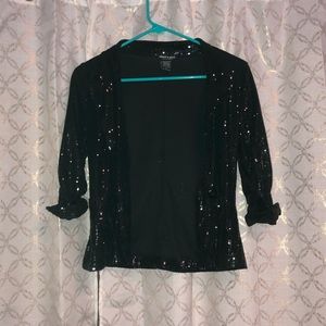 A 3/4 sleeved black fully sequined jacket. Buttons up and has pockets on both sides. Soft fabric on the inside and is stretchy.