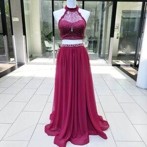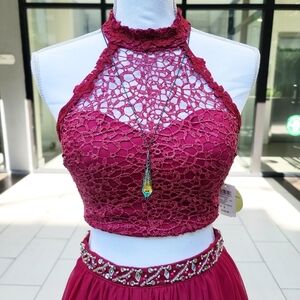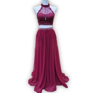 Designed in a rich merlot hue ✦ halter cropped top w/ padded bust ✦ glitter lace + sequin beading ✦ sheer illusion back ✦ satin maxi skirt w/ beaded waist ✦ extra‑large hemline for sweeping movement, this two‑piece gown is perfect for proms, galas, or pageants.