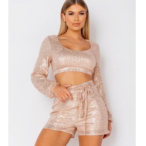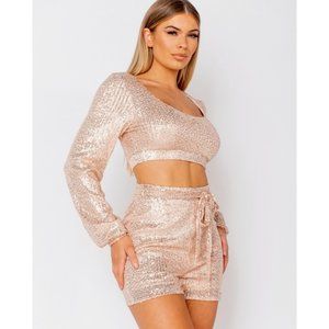 Sequins Long Sleeve Crop Top and Shorts Two Piece Set