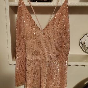 A beautiful spaghetti strap top with gorgeous rose gold sequins embellish thru out the top the strap crosses the top back can be dress up or casually. Could fit large also
