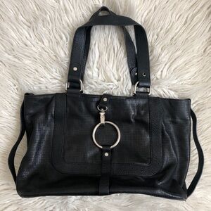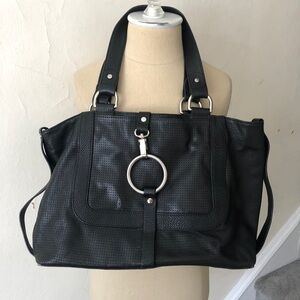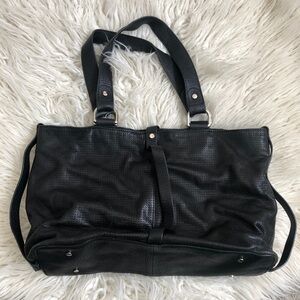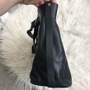 Perforated cowhide full grain leather shoulder tote bag from Sequoia Paris. Leather strap, silver hardware. Clasp closure on O ring. 2 outside large pockets (one on front and one on back. Inside zipper pocket and two open pockets. Minor wear on outside and lining, but still has a ton of life left. Approximate measurements: 16.5” w x 10” h x 5.25” d x 9” handle drop. Inventory: BB*tebm p1
