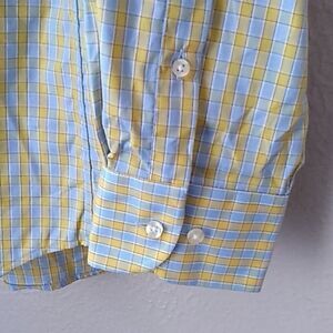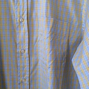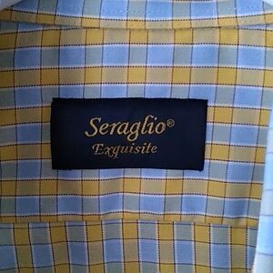 Seraglio yellow & light blue oxford shirt, plaid button-down top. Size - XL. Shirt has pocket on front left side & collar has small buttons in each of the corners to attach collar to body of shirt. Fabric tag is missing, but feels like a cotton. This is a nice quality button-down in great shape!