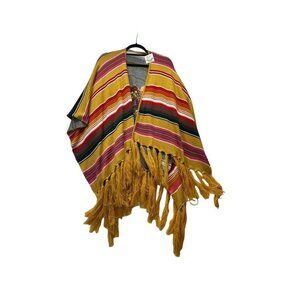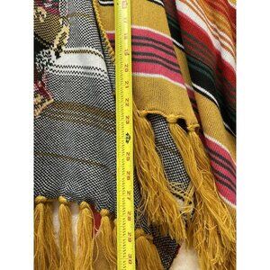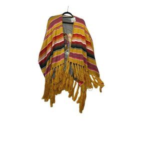 Serape Poncho Cow Skull Print W/ Fringe OS Mustard Pink Stripe Boho NWT