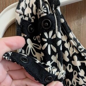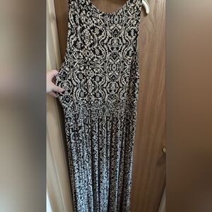 Chic maxi dress with sleeveless design, intended for nursing mother's. Buttons on both sleeves for easy access. Features a striking black and cream pattern, tapered waist and skirt. Perfect for any occasion.