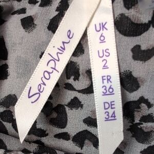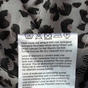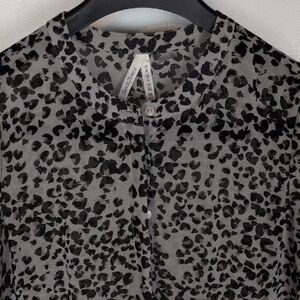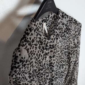 Black and gray leopard print. Full button front. Long sleeves. Sheer dress --- looks great over a slip dress or shortie bodysuit. Excellent condition -- no stains, holes, or fraying. Laid flat pit-to-pit: 17in. Laid flat waist: 15in. Shoulder to hem: 42in.
