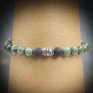This handmade Aromatherapy Bracelet is made of 6 mm Seraphinite and Lava Rock Beads, on latex free elastic cord. A Pewter Focal Bead finishes the Bracelet.