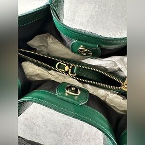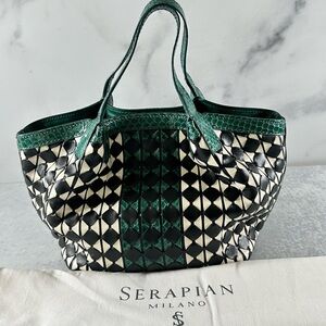 This bag is made from Mosaico leather, an exclusive weaving process dating back to 1947, a true emblem of Serapian