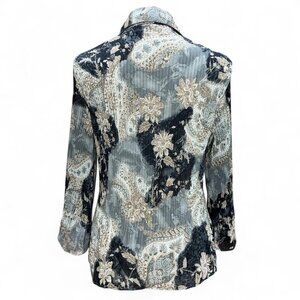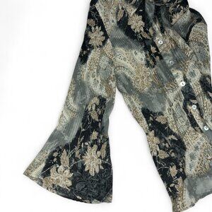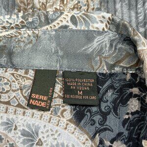 Sere Nade New York women’s paisley button‑up blouse in gray, black, and brown tones. Size Medium. Made from 100% polyester with pleated/seared detailing for texture and style.