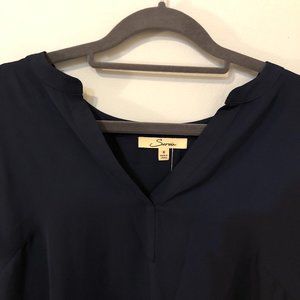 Lightweight semi-sheer navy blouse with a v-neck. High-low design with slits in the shoulders for an ultra-chic look! Listed as a small but could easily fit a medium.