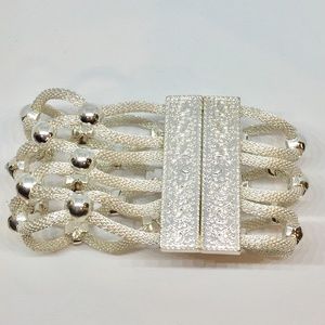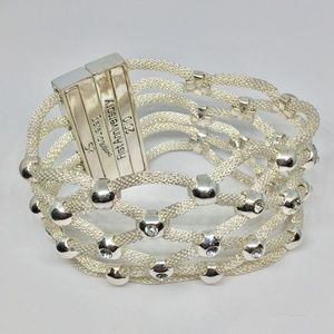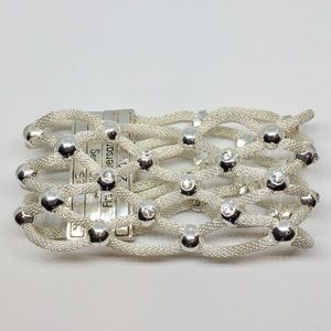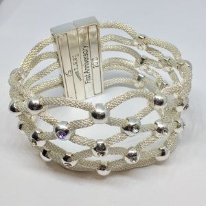 This is a Serena Williams woven mesh embellished with crystals. The bracelet measures 8 inches long and 1 3/4 inches wide. This bracelet has a extremely strong magnetic closure. Stamped Serena Williams, First Anniversary 2010. This bracelet is pre-owned in good condition.
