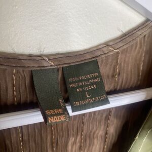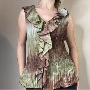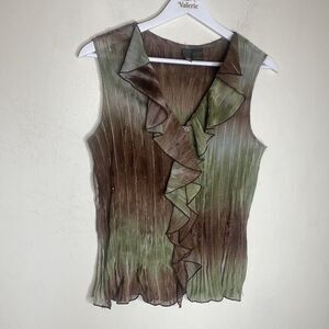 Serenade Y2k Style Green & Brown Crinkle Sheer Ruffle Blouse Top Large