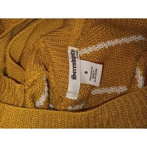 Crew neck front, v neck back, long sleeved gold and white striped 20 inches long, 23 inches pit to pit, Acrylic.