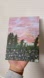Capture the serene beauty of nature with this one-of-a-kind, hand-painted acrylic canvas. This tranquil landscape depicts a stunning pink and lavender sunset over a mountainous horizon, framed by lush green pine trees. The foreground is filled with a field of delicate wildflowers, adding a pop of purple and white against the deep green scenery. 🪻A flock of birds soars through the sky, completing this peaceful scene. ✨