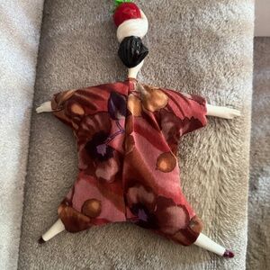 This 1999 Poupee Millet is signed by Serge (the artist). A rare collector's item that features a strawberry on top of whipped cream on the head with a beautiful matching/color fabric. This doll measures about 12 inches toes to head. This doll is like new, there are no blemishes, cracks, rips, etc... purchased and owned by one person from a pet free and smoke free home. In 1983 the “Poupee Millet” studio opened in Paris, France with two artists: Serge Chichportich, born in Paris, France, and Pablo Pares, born in Buenos Aires, Argentina. Of the two original artists, Serge is the only one still creating the original Poupee Millet. Each piece is truly a work of art – individually handcrafted and hand sewn and filled with millet, featuring fanciful headdresses and a myriad of exotic fabrics.