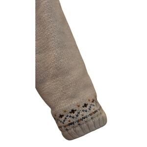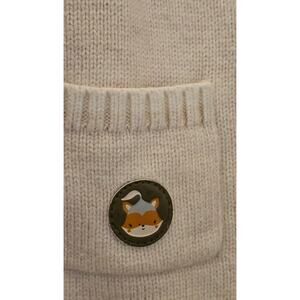 Details: Button-up cardigan with ribbed collar and cuffs. Features a charming fox and geometric pattern across chest and sleeves. Two front pockets, one with a circular animal patch. Warm and cozy—ideal for cooler weather.