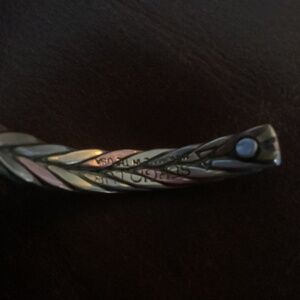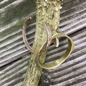 This listing is for both items. These are very beautiful heavy and well made pieces. One is a solid heavy brass bangle (no maker found) and the other is a brass, copper and silver braided cuff made by Sergio Lub. (It appears to be magnetic for healing purposes). The brass bangle is set in size and the braided cuff can bend and adjust to any size.