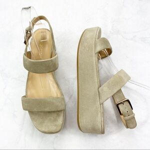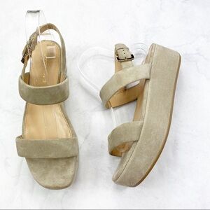 Sergio Rossi Classic Suede Edwige Sandal. Open Toe. Ankle Strap with Adjustable Buckle. Wedge / Platform. Insoles with Designer Lettering. Leather Soles. Light Gray Beige Tan Color. Super Cute & Comfy. No Stains or Rips. NWT / New Never Worn. Great Condition.