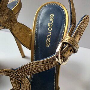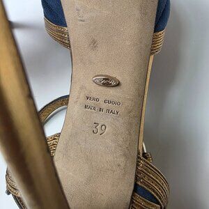 Gorgeous Sergio Rossi gold and navy blue strappy high heel sandals, handcrafted in Italy.