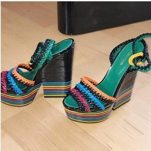 Sergio Rossi black leather platform sandals, never worn only tried on. Features multicolor platform and woven ankle straps.
