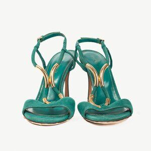 Made in Italy, these Twist sandals from Sergio Rossi are crafted with a soft goat suede in a Radiant Green, and features covered stiletto high heels, open almond toes, exquisite gold-tone inserts for a touch of sophistication, buckled slingback straps, and leather lining and soles.