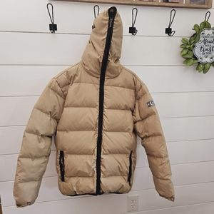 mens nuetral beige puff down jacket coat 70% down 30% feather super warm for the cold weather zips up all the way has pockets has minor darker spot near chest small piling near zip see all pics Brazil sz 38 equivalent to mens us sz M