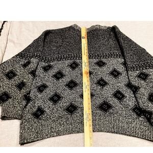 Great preowned condition. Most of the sweater is acrylic with small strips of genuine leather. See pics for measurements.