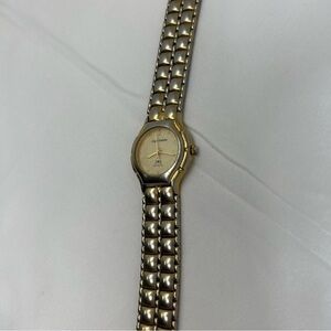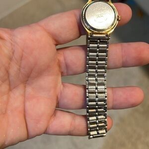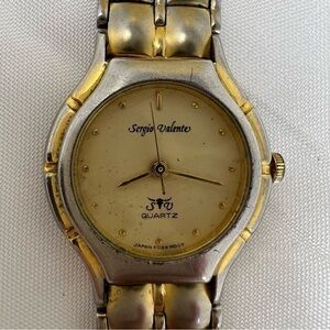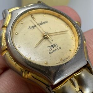 The battery has just been added and it's in full working order. This is a gold and silver Sergio Valente watch ...it is a stainless steel interior. There are scratches on the surface but still in full working order. This is a vintage beautiful timeless piece. It will be packaged with care and mailed same business day.