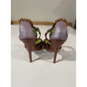 The Shoes are Made by Hand in South Brazil. They Feature a Wooden Stiletto Heel (4.5 inch), Reptile Textured Front Strap and Some on the Sides, Animal Print Calf Hair, Gold chain Detail Over Lilac Colored Back Heel as well as Gold Buckle and Side Details. The Sandel Has Printed Fabric Detail Along the Edges of the Shoe.