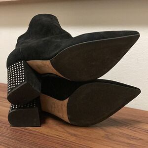 Sergio Rossi 75 crystal embellished black suede ankle boot with pointed toe, 3 in. block heel embellished with 75 crystals, leather upper & lining, rubber sole, side zipper. Made in Italy. Size 38/8. Fits true to size.