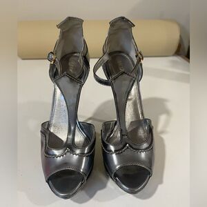 Beautiful Sergio Rossi Gunmetal/Silver/Metallic Heels. Ankle Strap with a Gold Metal Closure.
