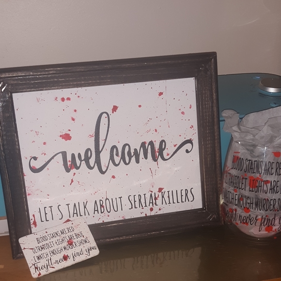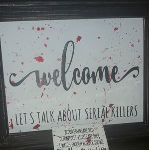 Welcome! Let's talk about serial killers! This 8 x 10 handcrafted reverse canvas sign is a conversation starter! A great piece of home decor for the true crime lover. Each sign is unique due to the blood splatter pattern. Custom pieces can be made as well. This listing is for the sign only and does not include the stemless wine glass or fridge magnet