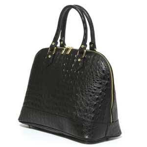 Crafted of calfskin with a handsome crocodile texture, this domed handbag measures 14" x 11" x 6". The zipper closure opens almost all the way down the sides for access. The interior is fully lined in platinum nylon satin, with one zippered and two open pockets. Double handles have 6" drop. Detachable shoulder strap has 20" drop. Gold-toned hardware accents, with coordinating feet on the base. Comes with sleeper bag. Overweight item.