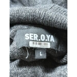 The Ser.o.ya Alexandria Sweater Dress in size Large is a stylish and versatile piece. This gray turtleneck dress features shoulder pads, ruched skirt, long balloon sleeves and a knit fabric blend of nylon, viscose, cashmere, and wool, making it cozy and chic. The short length and classic design make it a wardrobe staple for the winter and fall seasons, adding a touch of flair with its back cut-out detail.