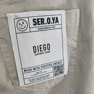 Elevate your streetwear game with these Ser.O.Ya Diego jeans. The khaki distressed denim and raw hem detailing give off a grunge vibe. The 5-pocket design, complete with button and zipper accents and the brand's logo, provides ample storage space for your belongings.