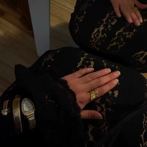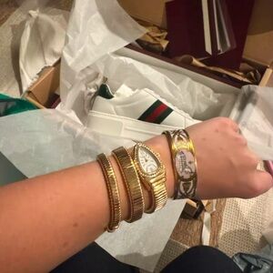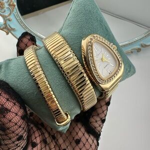 This stunning gold watch and bracelet set adds a touch of elegance to any outfit. Perfect for any occasion, this set is a must-have accessory.