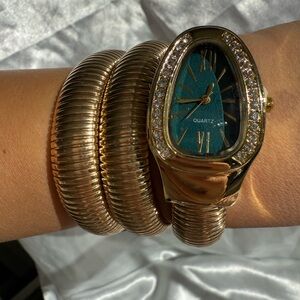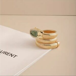 This luxurious gold-tone wrap watch features a flexible snake-like coil bracelet and a striking green dial framed with sparkling crystals. A bold fashion statement that blends sophistication with edge.