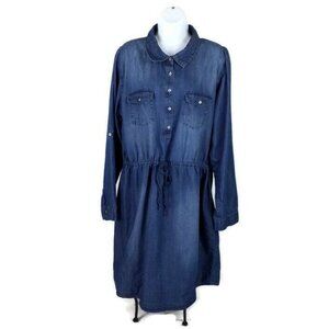 Serra Blue Chambray Button Front Long Roll Tab Sleeve Tie Waist Dress Womens XL