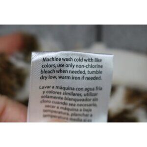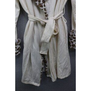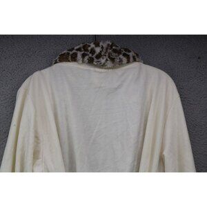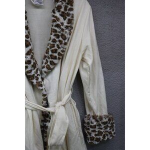 This is a Serra Faux Fur Collar and Trim Robe that is a size Large-X Large. It has pockets and ties in the front. It is 63% Polyester, 34% Rayon, and 3% Spandex. It is very soft. Laying flat, it measures: Armpit to armpit-22" and the Length is 36". It is in good condition.