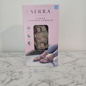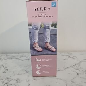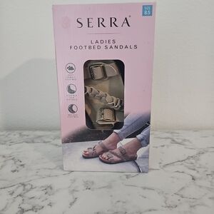 The Serra Ladies Footbed Sandals are stylish slip-on sandals designed for women. These beige sandals feature a comfortable footbed for all-day wear and are made from man-made materials. With a US shoe size of 8.5, these sandals are a versatile addition to any woman's shoe collection, providing both style and comfort.