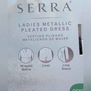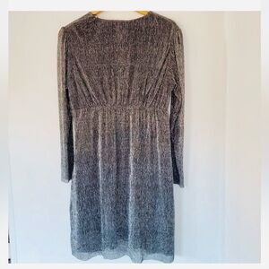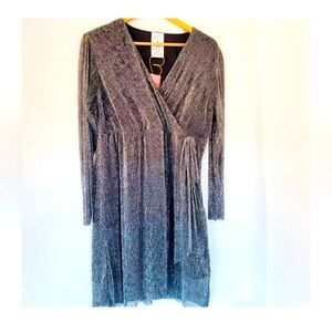 Serra, black/silver pleated - Brand new with tags, lined dress, metallic , size XL- 16/18 , vneck , long sleeve, wrapped bodice, polyester, spandex