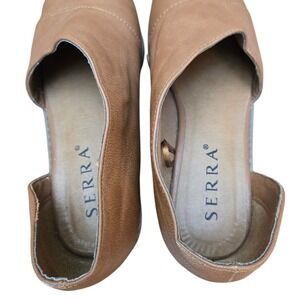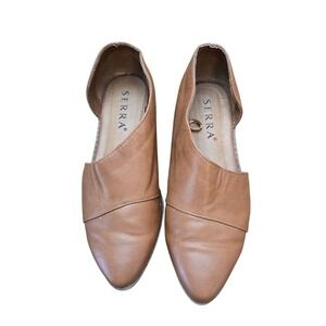 Stylish and comfortable d'Orsay flats by Serra, perfect for everyday wear. These slip-on mules feature a sleek, pointed-toe design and a unique side cutout, adding a touch of modern flair. The versatile tan-brown color complements a variety of outfits, making them a wardrobe staple.