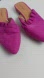 Chic pink suede sandals with ruffle accent. Stylish and comfortable.