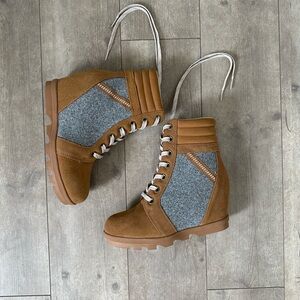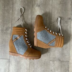 Serra Wedge Hiking Bootie Cow Suede Leather Tan/Gray Womens Size 8 Never Worn
