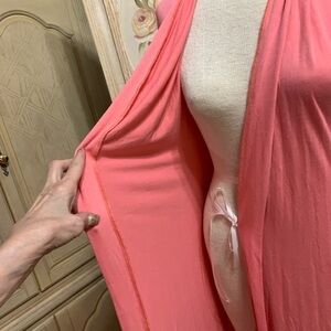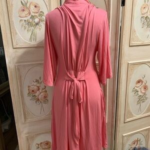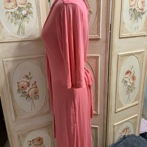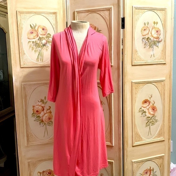 Adorable housecoat in Barbie pink has elastic in lower back to accentuate your figure and an inner tie ribbon to bring closure three-quarter inch sleeves beautiful drape to it material is 95% VISCOSE and 5% ELASTANE light enough to wear now with air conditioning and warm enough to wear in the fall with none size is SX/S and attached tie belt that can be in the front or the back