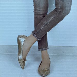 Serra Ladies Flats Shoes NWT in box Gold in Color with accent bow Size is 9 Memory foam Easy slip on Style Flexible Outsole