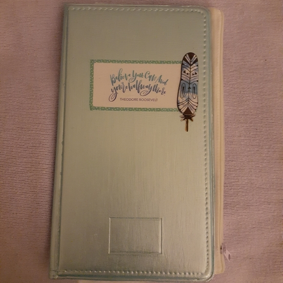 Hand crafted server wallet. Ice blue finish with Roosevelt quote, "believe you can and you're halfway there". Triple sealed protective covering ensures longevity in any hectic restaurant environment.