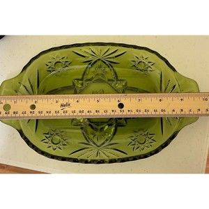 VTG Serving Dish Green Divided Relish Glass Star Cut Design Would make a great candy dish or relish dish Dish is in great condition Item comes from a smoke free home