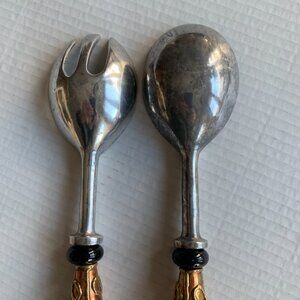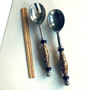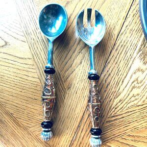 Lovely serving pieces each 12".Decorative brass embossed handles with glass bead trim. Substantial heft in hand. Silver tone with the spoon showing a bit more patina than its mate. A forever serving item.