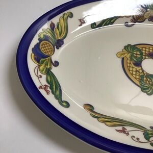 Rosemaling with lattice look pattern. 1 slight manufacturing defect (see last photo). Otherwise, oval platter is in overall excellent preowned condition; no chips or cracks, glossy finish.